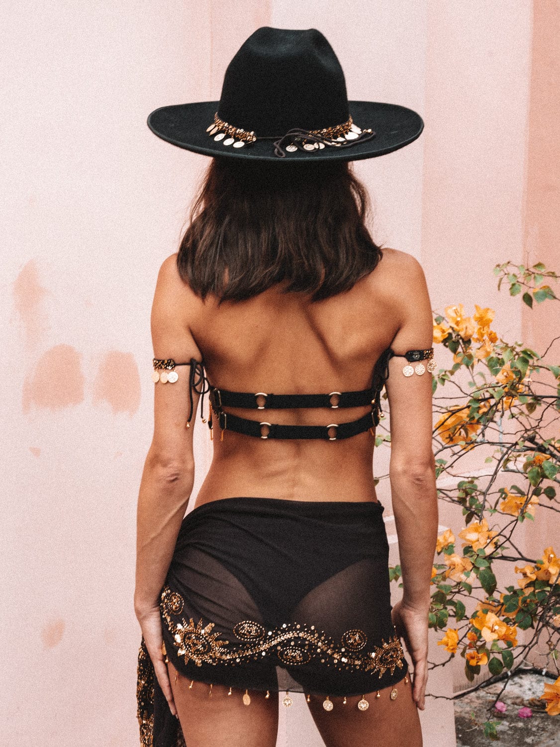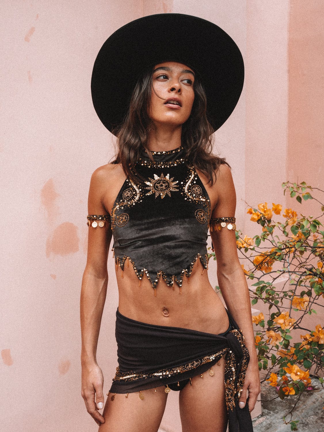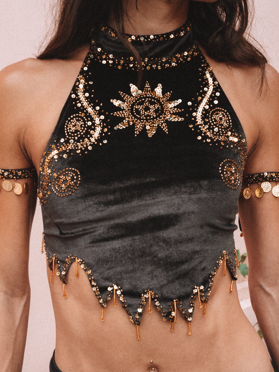 Hand-embellished with western gold sequins and beads, the intricate details are a nod to vintage western nostalgia. Every sequin and bead is stitched by hand, making each piece a special treasure, perfect for your next festival or special event.