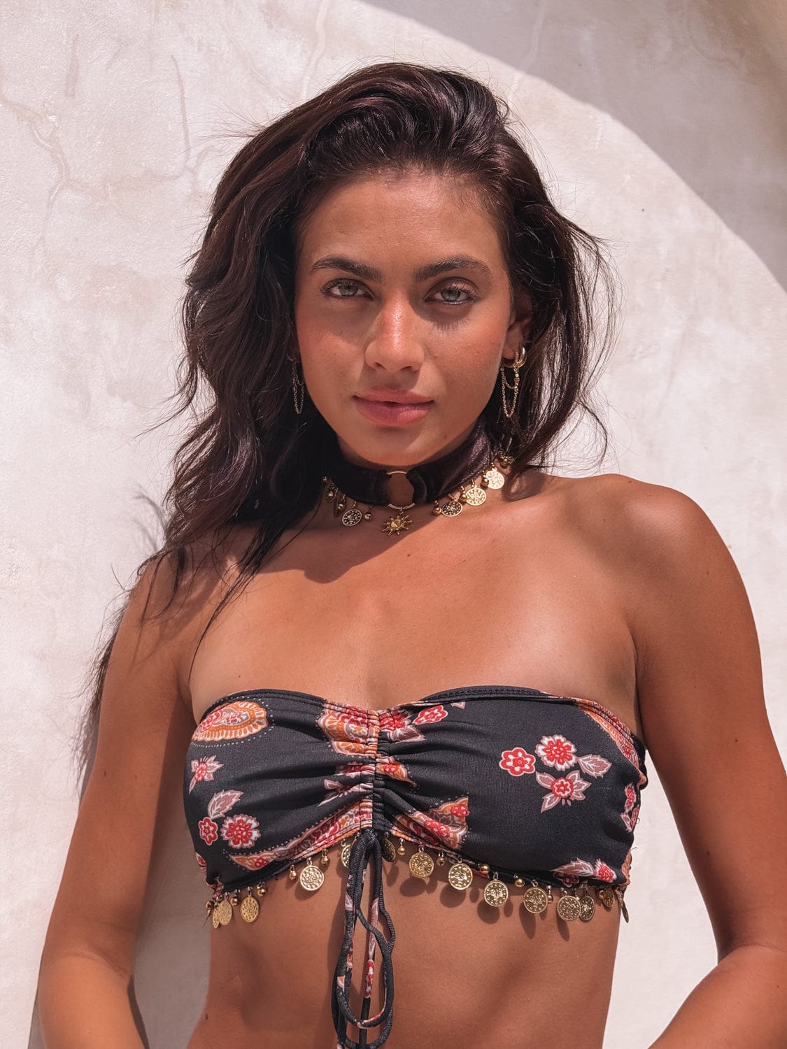 Adorned with hand-sewn gold coins and finished with a ruched, adjustable front, this piece offers the perfect balance of comfort and support — whether you're dancing under the sun or the stars.