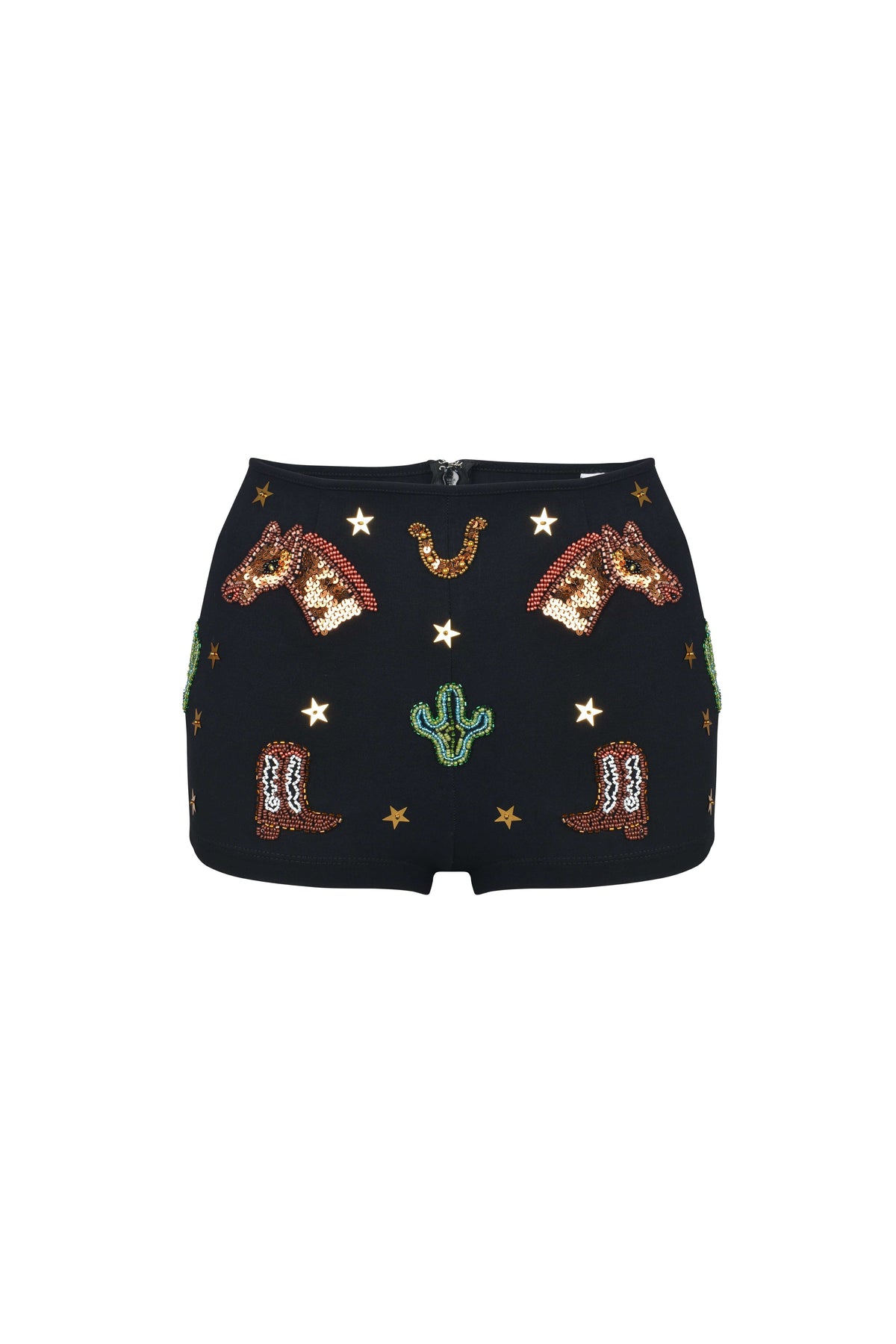 Hand-made from a comfortable stretch fabric that flatters in all the right places and adorned with hand-embellished sequins and beads in shimmering gold and earthy tones, they feature playful western motifs—horses, cacti, cowboy boots, and lucky horseshoes—designed to catch eyes and spark smiles.