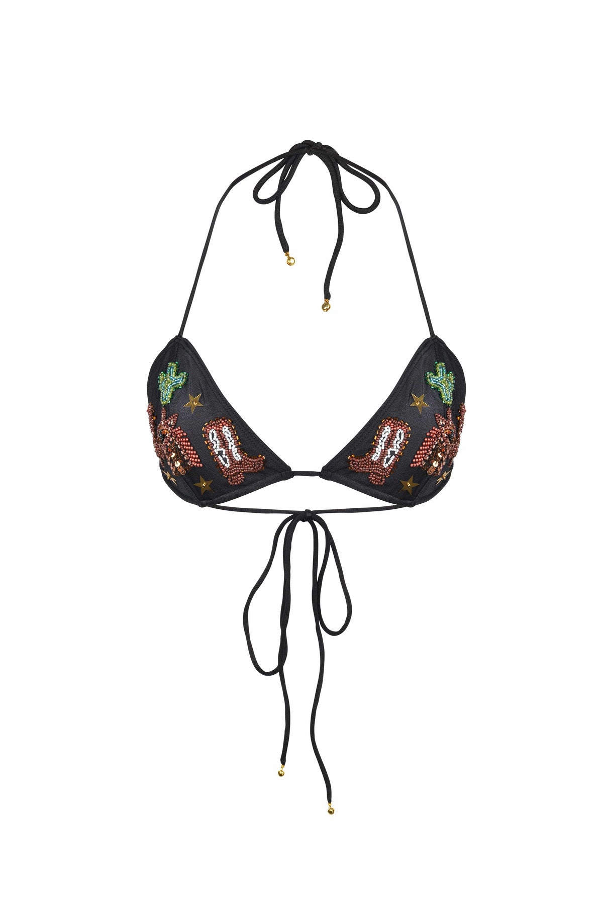 Saddle up. The Yee-haw Bikini Top is here to turn heads with its all-over sequins and hand-sewn Western details of sparkle horses, cacti, cowboy boots, and lucky horseshoes. It’s a definite conversation starter, made with conscious production in mind. Pair it with the matching Yee-haw Bottoms if you’re into getting noticed (in a good way).
