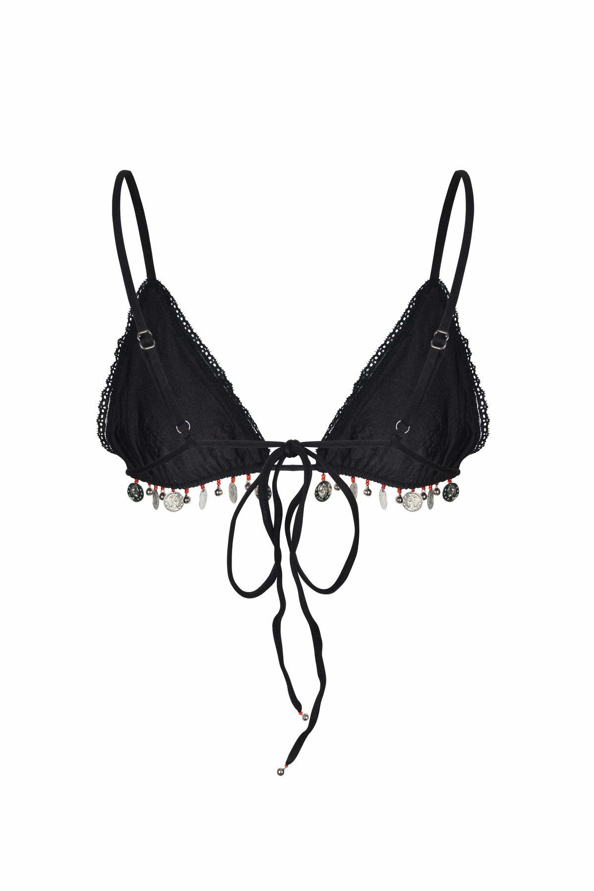 Designed to make a scene with its silver jingles and coins details, our Solène Bikini Top is an undeniably special choice for festivals and memorable occasions. Each shimmering piece is adorned with sparkly strawberry sequins and tiny glass bead details. Best worn with any of the matching Solène bottoms and accessories (sold separately)