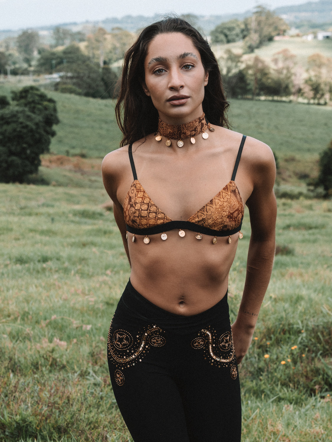 Meet the Aliah bralette— Handmade with gold coin and bead embellishments. The adjustable back and straps ensures a comfortable fit.