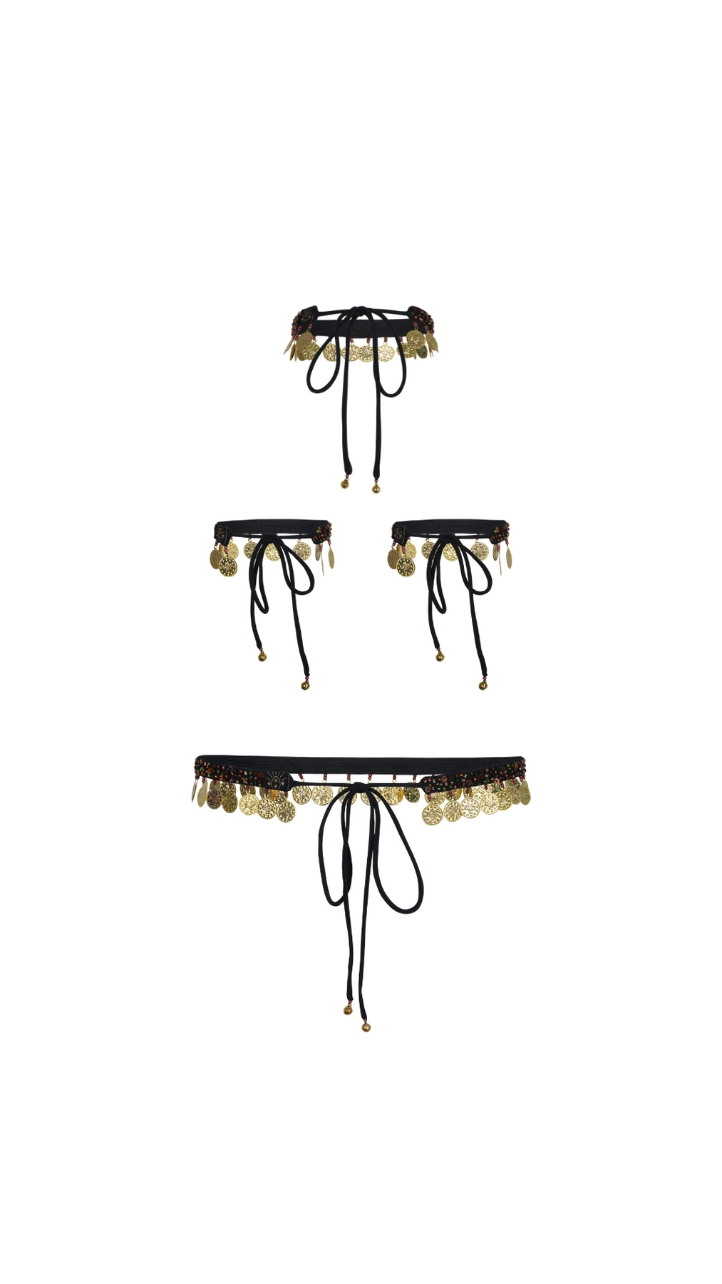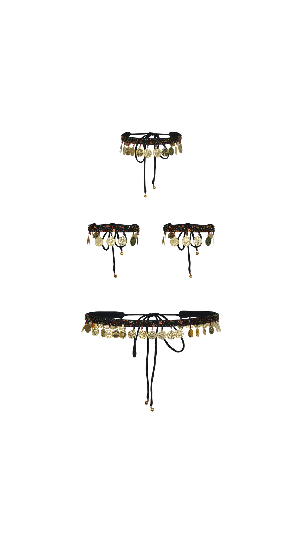 • Set includes 1 x choker, 1 x  belt & 2 x bands which can be worn on the arms, thighs or ankles.