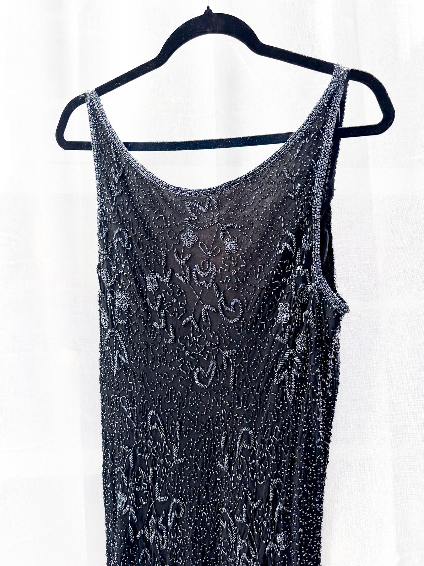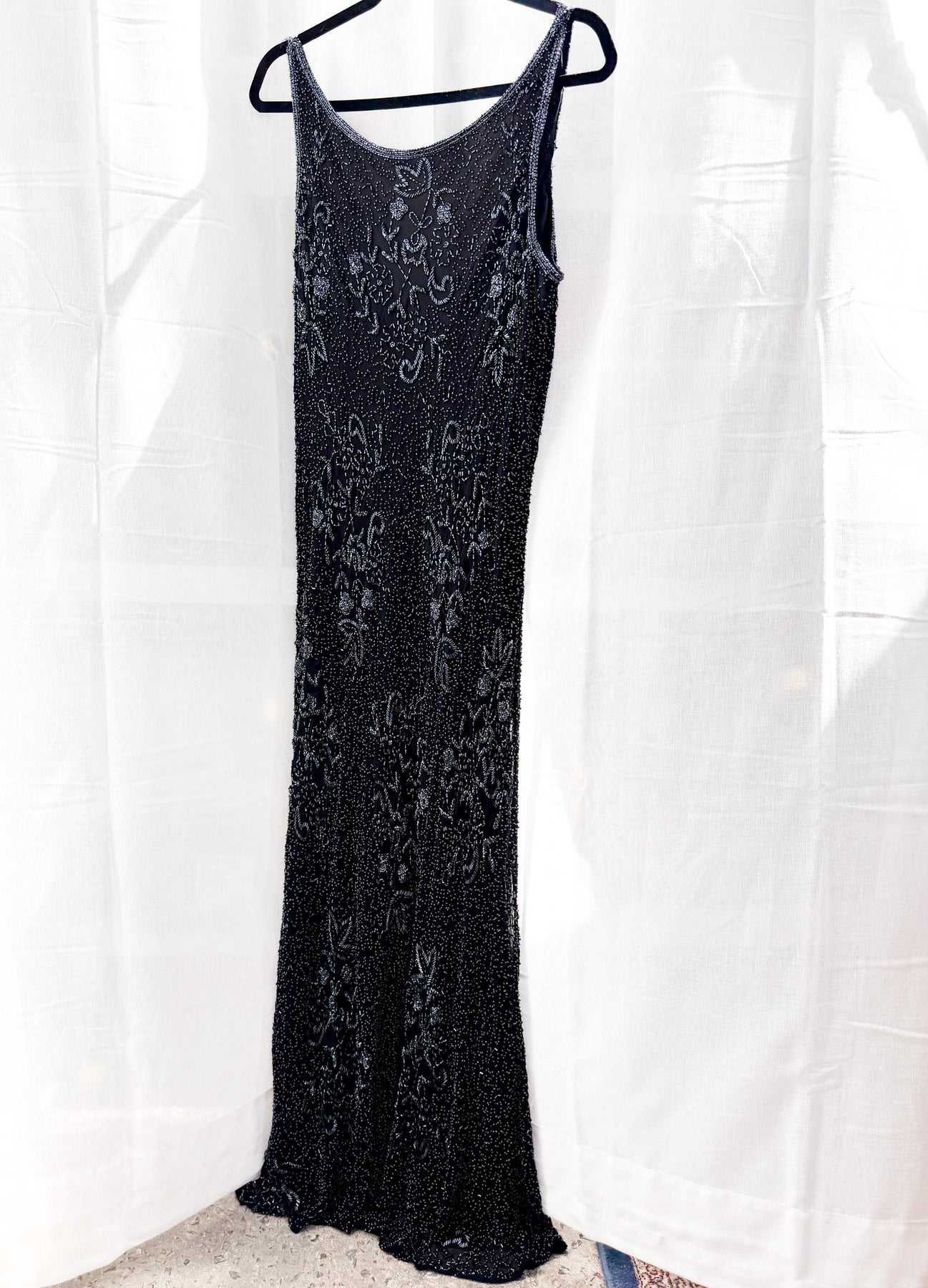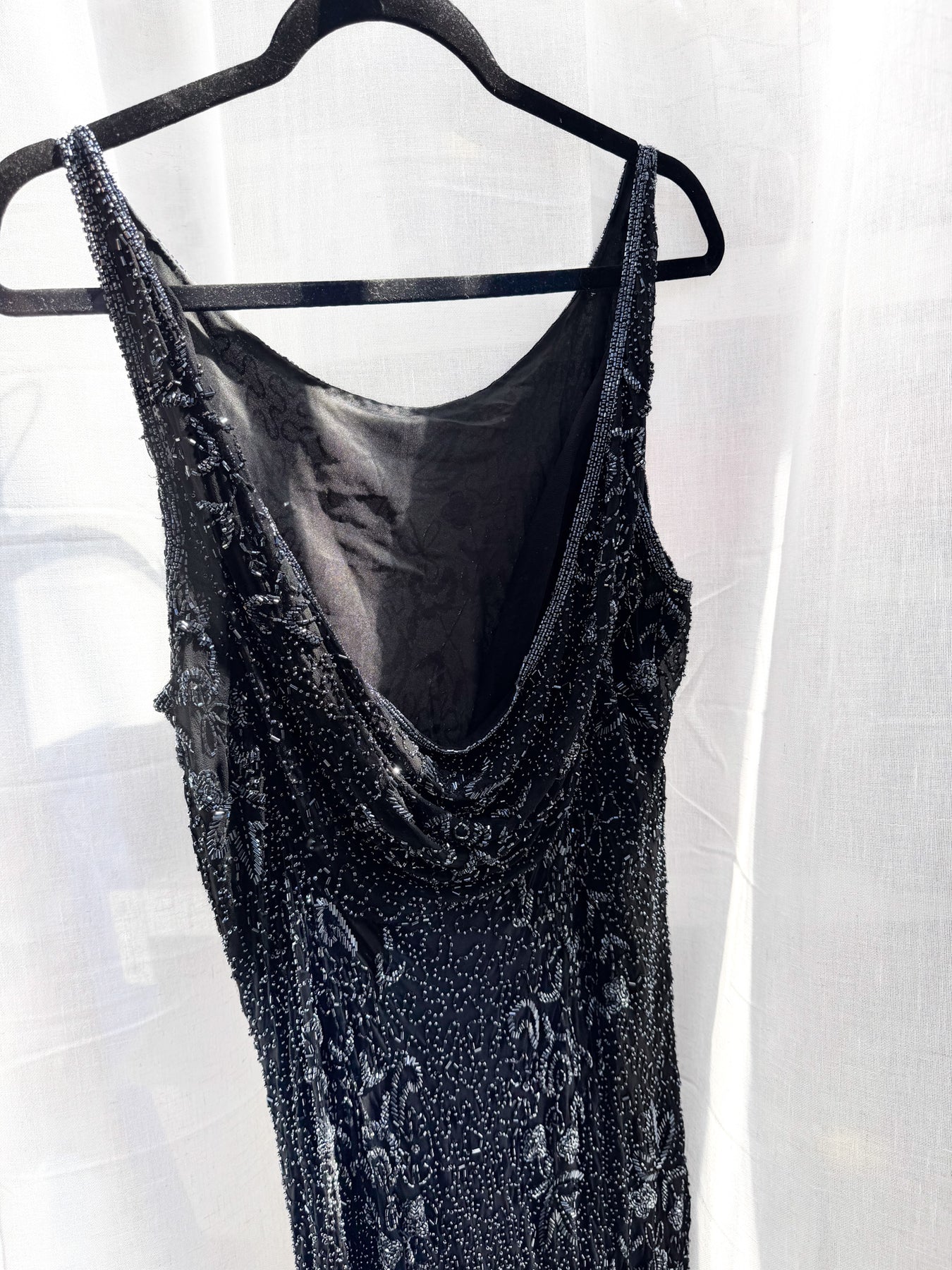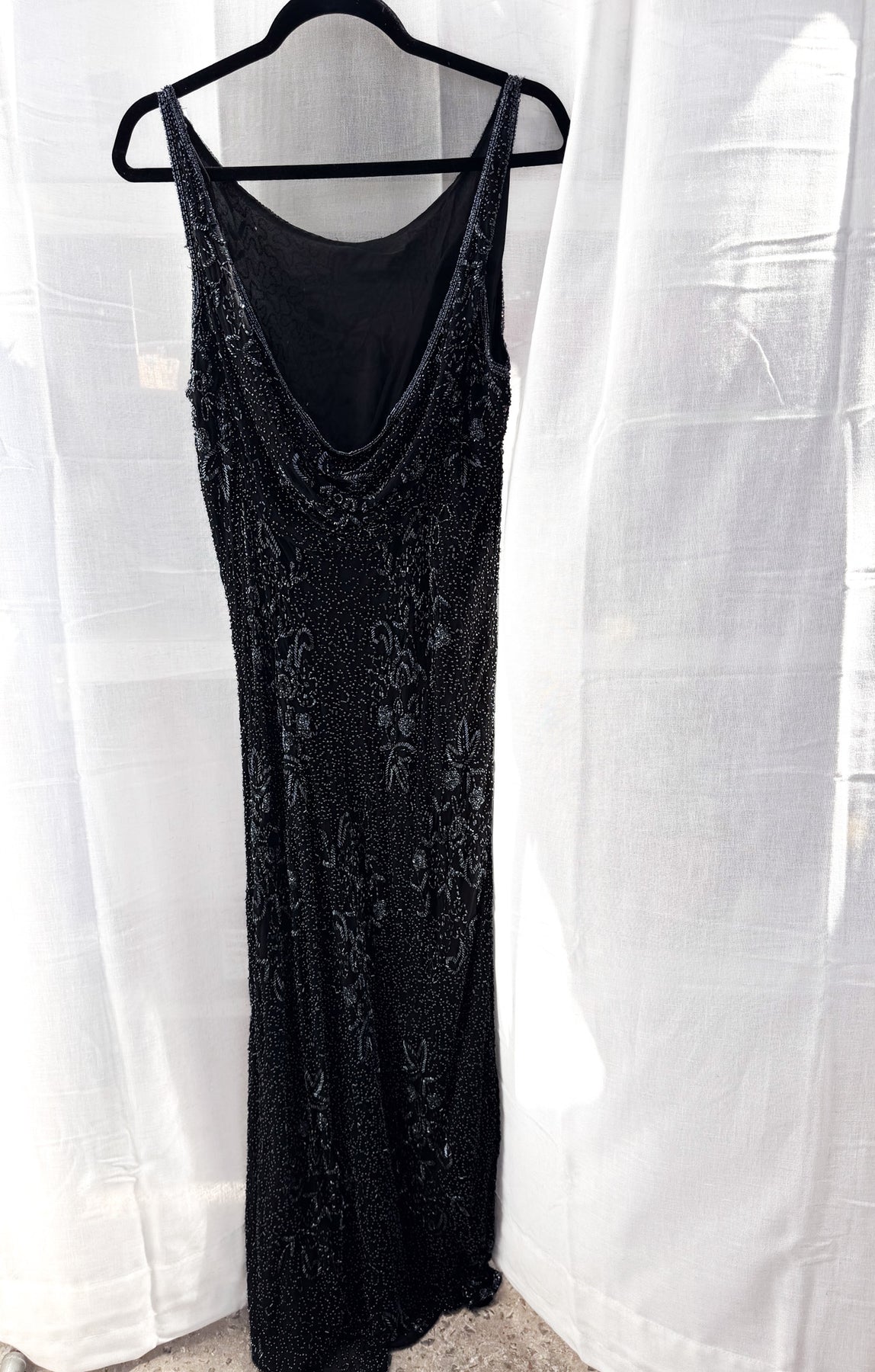VTG DAISY BLACK BEADED LOW BACK SLIP STYLE GOWN DRESS / XL