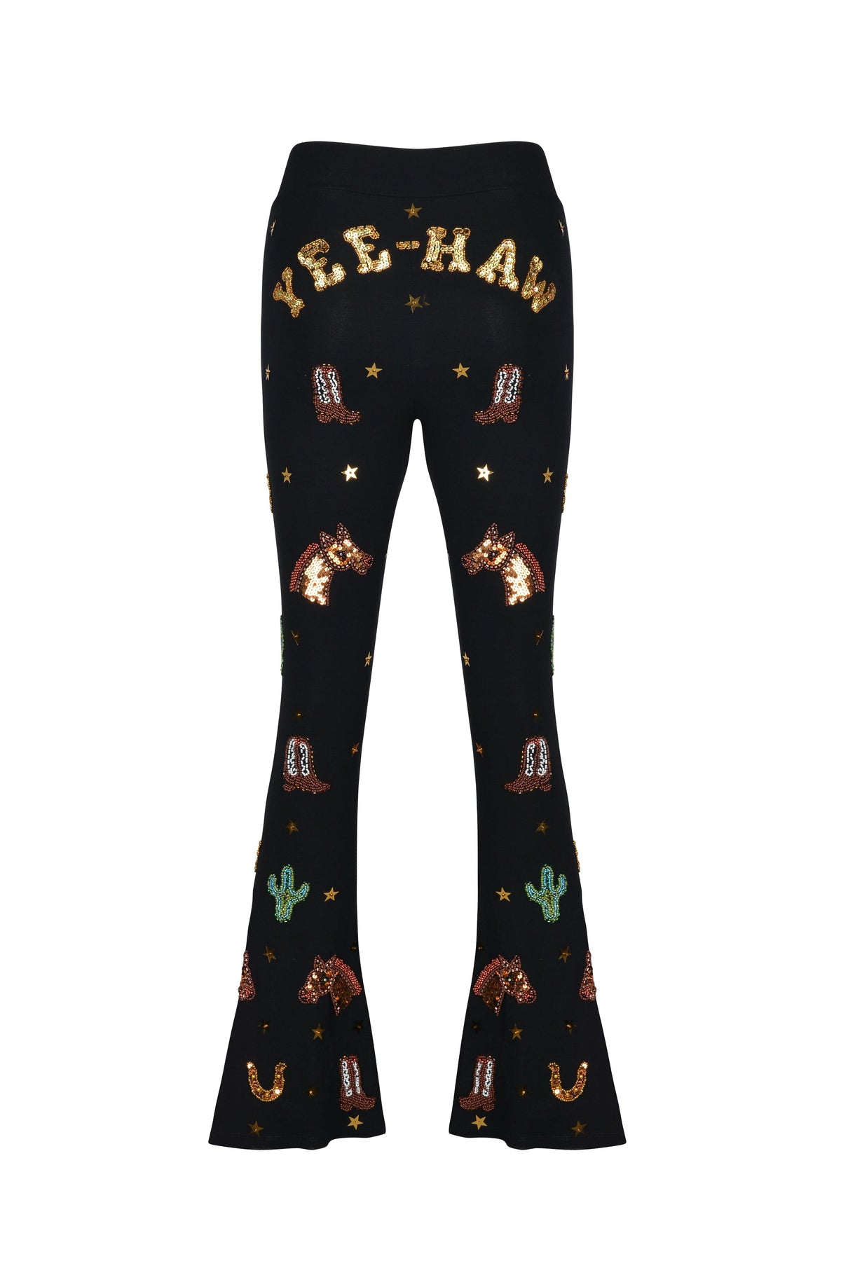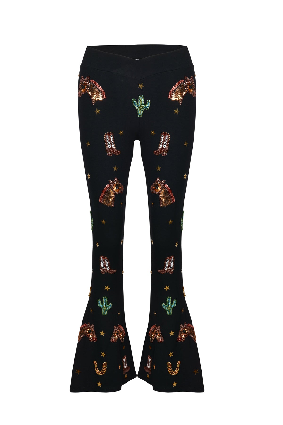 Hand-embellished with shimmering gold sequins and earthy-toned beads, each pair is adorned with quirky western motifs—horses, cacti, cowboy boots, and lucky horseshoes. Every detail is designed to stand out, making these flares as unique as you are.