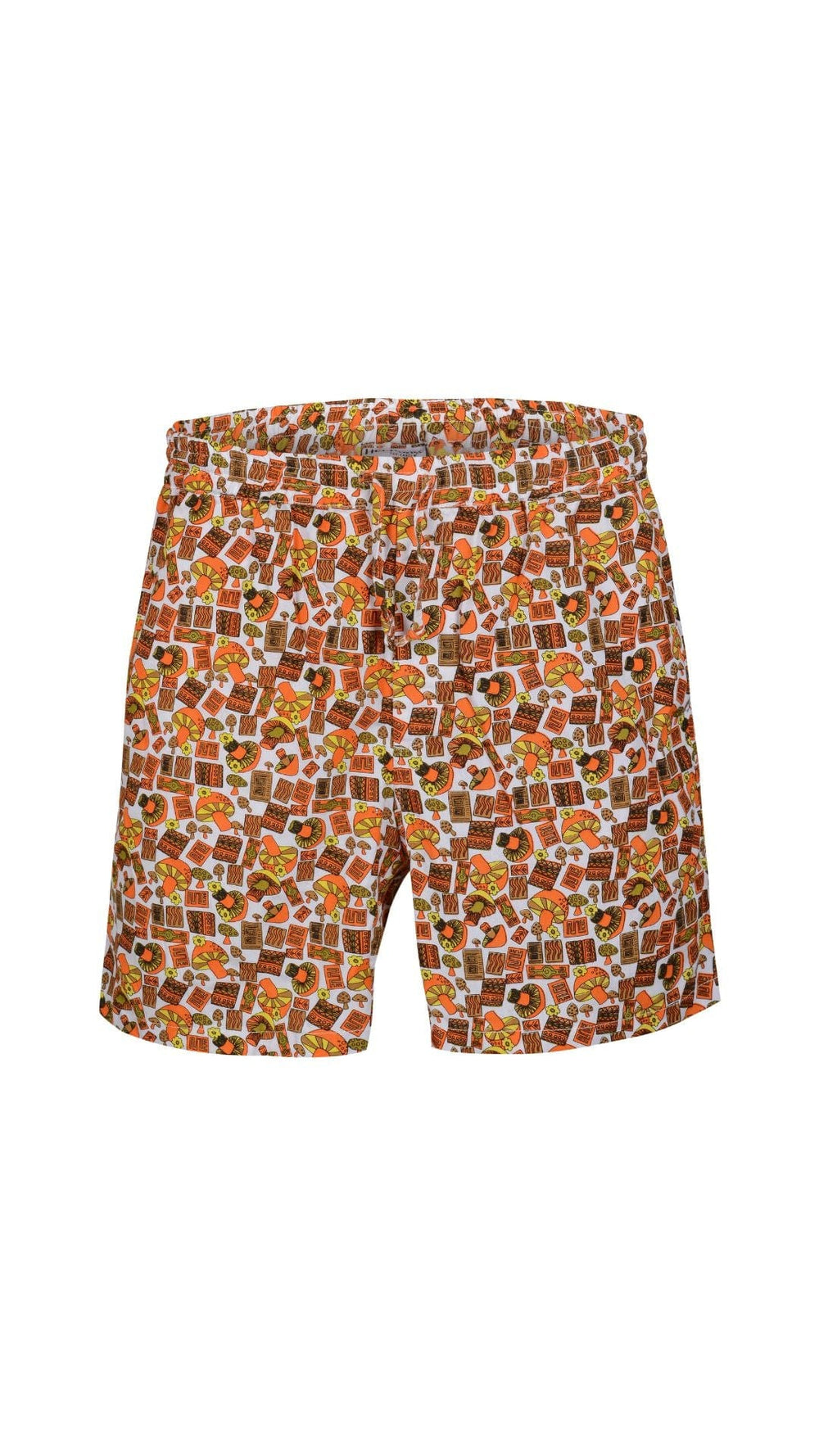 These high-waisted swim shorts combine & support with a cheeky fit that’s perfect for water adventures. Featuring a vibrant orange ’70s tribal mushroom print, they’re crafted from eco-friendly fabric that’s durable for surfing, swimming, and exploring. Designed to glow under UV lights, they’re equally at home at festivals as they are by the water.