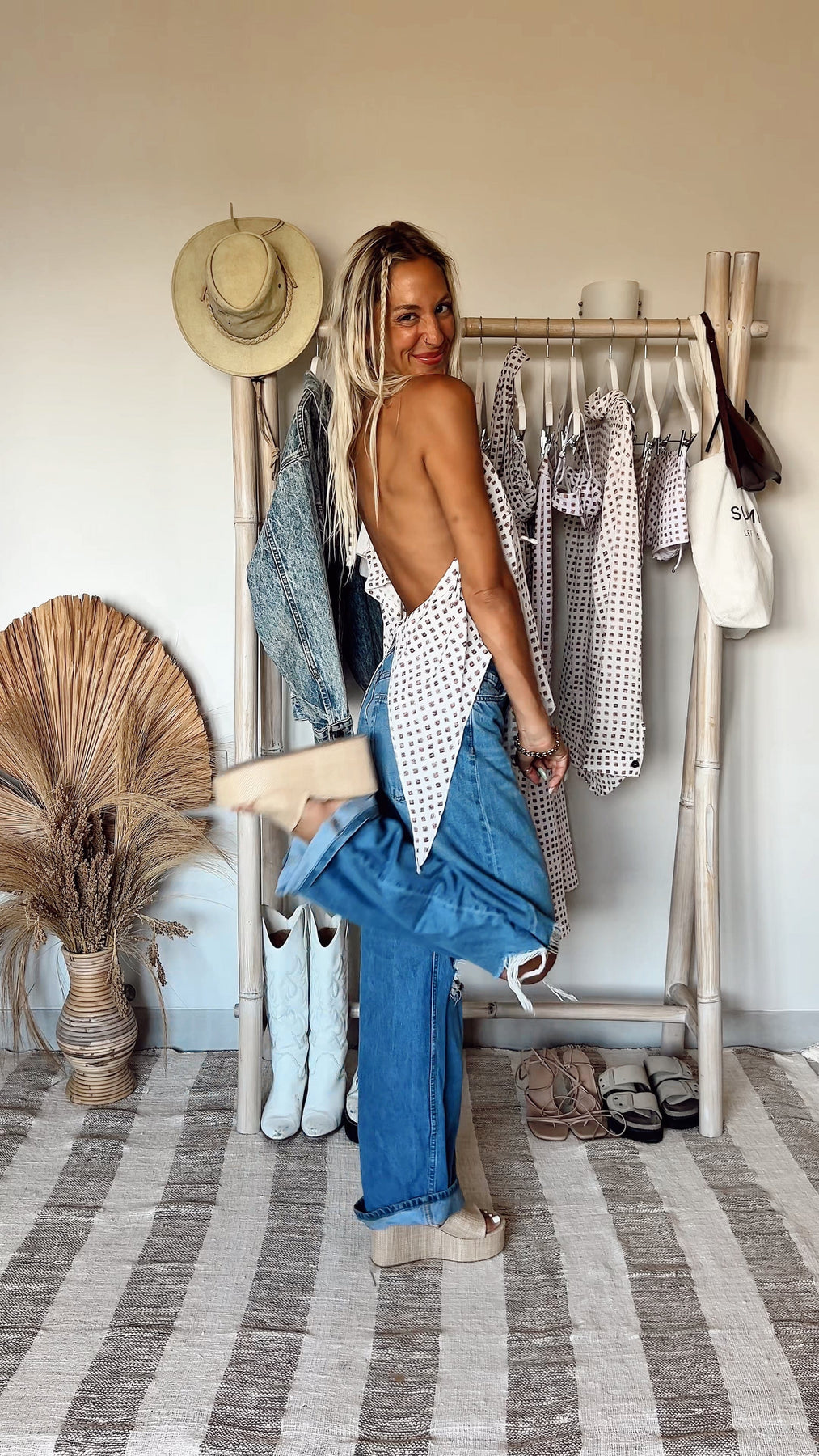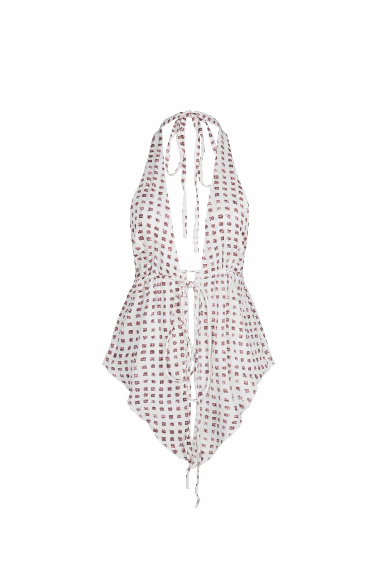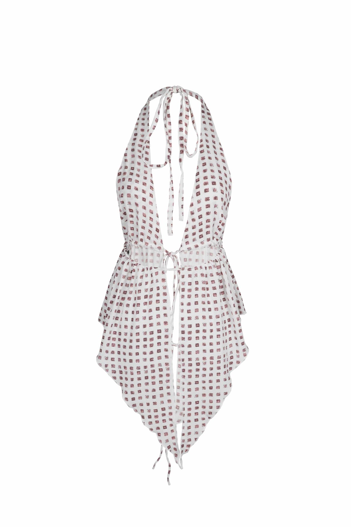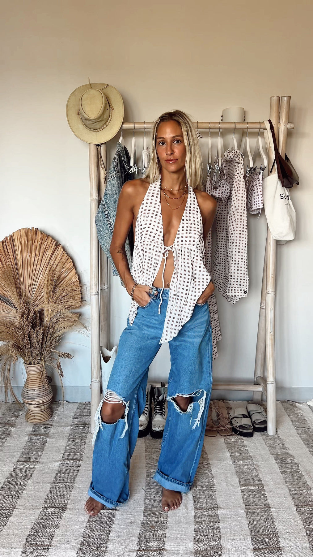 This statement halter is all about soft, floaty movement. Featuring an adjustable tie front and halter neckline, it drapes effortlessly with a delicate pixie-style hemline along the front and back. This is a flattering style and can be worn as a set with the matching shorts and also pairs well with plain bottoms.