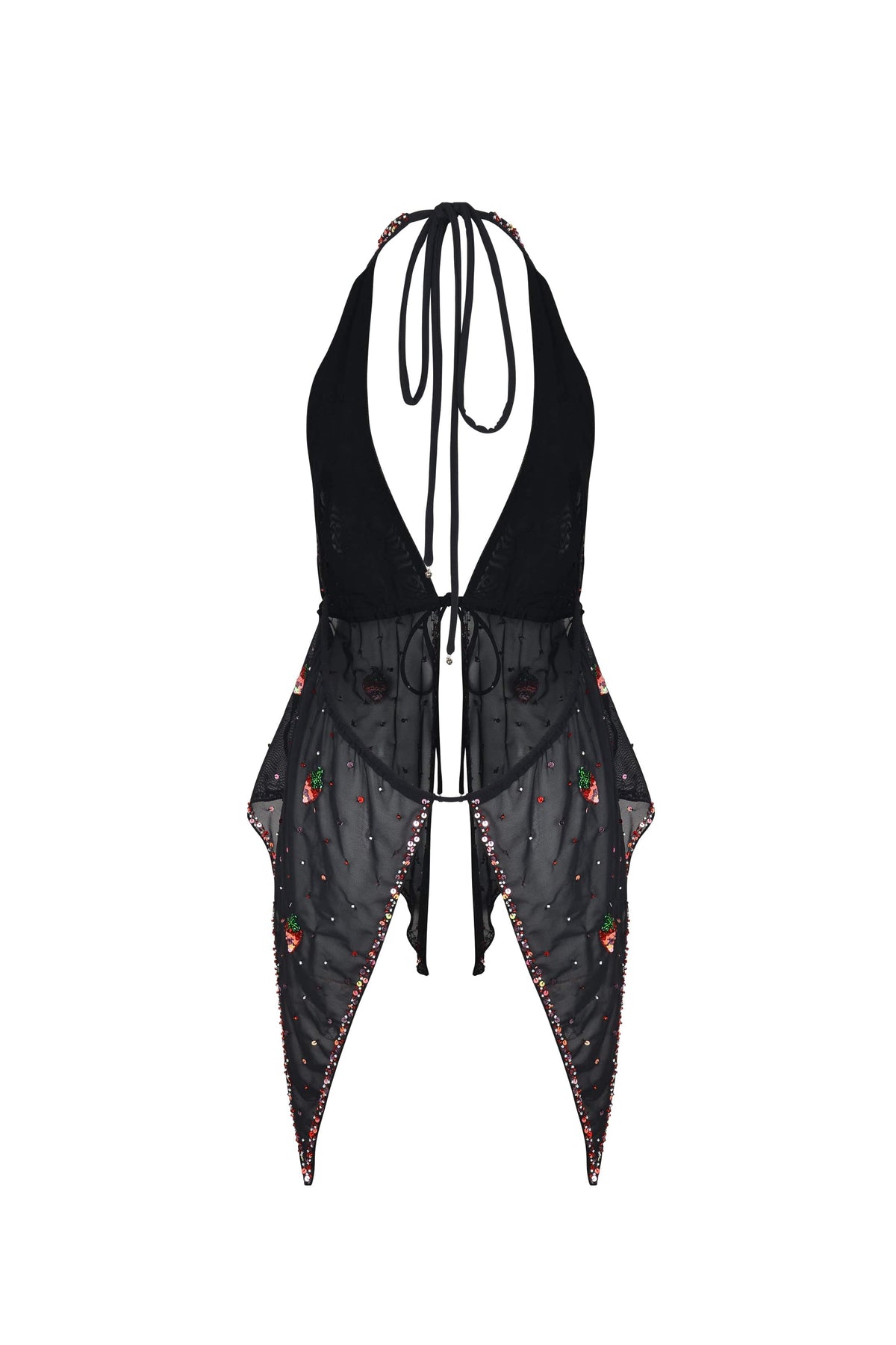 Hand-embellished with sparkling strawberry sequins and delicate glass bead details, this halter is a standout from the Solène collection — playful, sparkly, and made to be remembered. Designed for soft, floaty movement, it features an adjustable tie front and halter neckline, with a gently draped pixie-style hemline that falls just right.  Style it with the matching bottoms for a full look, or mix it into your wardrobe for something special.