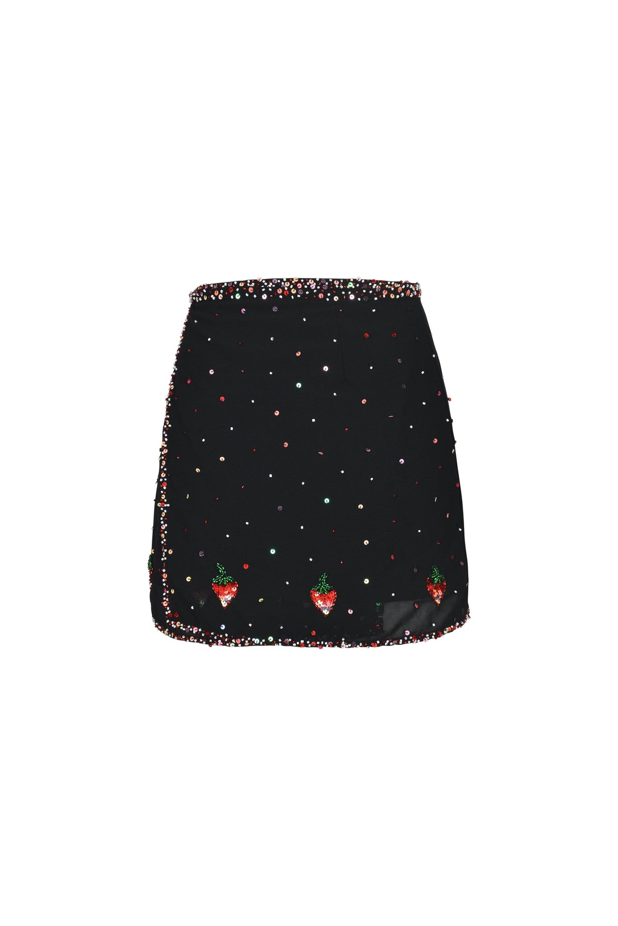 The Solène Wrap Skirt is a playful piece with a thoughtfully flexible fit. Designed to be worn extra short, it features a small black outer tie for added adjustability (not shown in images)—so you can wear it higher on the waist or lower on the hips, depending on your vibe. Hidden internal ties offer further customisation, giving this size-fluid style an easy, comfortable wrap. Hand-embellished with sparkling strawberry sequins and tiny glass beads, it catches the light with every step. Be sure to check the size guide before ordering.