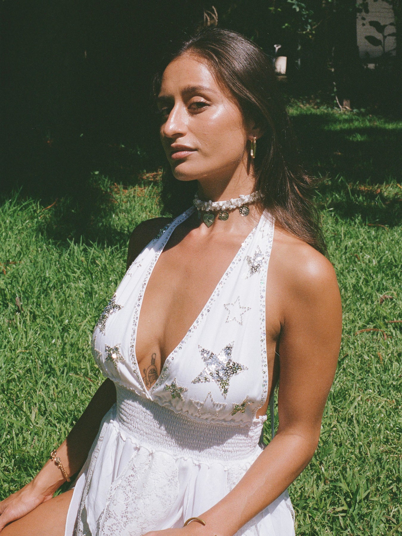 Introducing the Phoenix Pixie Mini Dress — Hand-made in limited numbers, it features a shimmering beaded top and a skirt of cascading diamond-patchwork panels. The plunge halter neckline with multi-way straps can be tied different ways — cross them at the back for extra support, or style them your own way.